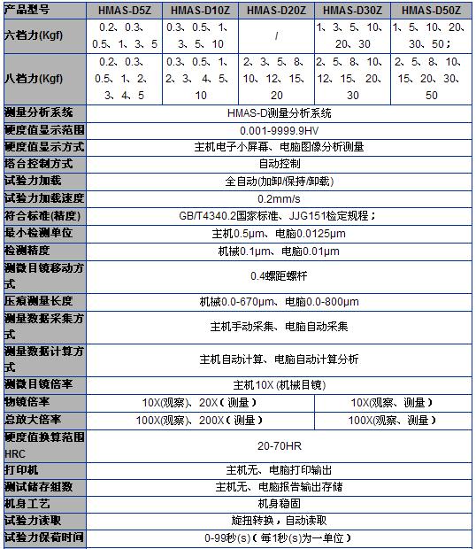 HMAS-D5Z/10Z/20Z/30Z/50Z維氏硬度測(cè)量分析系統(tǒng)是本公司推出的第六代光機(jī)電一體化的高新技術(shù)產(chǎn)品,該機(jī)器造型新穎,具有良好的可靠性,可操作性和直觀性,是采用精密機(jī)械技術(shù)、光電技術(shù)、圖形圖像處理技術(shù)和材料硬度分析軟件的新型維氏和努普硬度測(cè)試儀器。 性能特點(diǎn) 1、外觀新穎,采用微機(jī)控制自動(dòng)轉(zhuǎn)塔通過(guò)軟件執(zhí)行操作,進(jìn)一步實(shí)現(xiàn)測(cè)量的智能化。 2、設(shè)備擯棄傳統(tǒng)繁瑣測(cè)量步驟,測(cè)量方法更簡(jiǎn)便 3、設(shè)備自帶打印功能,可將相關(guān)測(cè)量參數(shù)打印并保存 4、設(shè)備能對(duì)被測(cè)材料進(jìn)行拍攝并能對(duì)其組織進(jìn)行分析和讀取 5、可調(diào)節(jié)測(cè)量光源強(qiáng)弱,可預(yù)置試驗(yàn)力保持時(shí)間、并能切換維氏和努氏試驗(yàn)方法 適用范圍: 熱處理、碳化、淬火硬化層,表面覆層,鋼,有色金屬和微小及薄形零件等.配備努氏壓頭后能測(cè)定玻璃、陶瓷、瑪瑙、人造寶石等較脆而又硬材料的努氏硬度. 技術(shù)參數(shù):